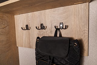 Hallen är både praktisk och välkomnande, med krokar för ytterkläder, skohylla och garderob som ger god ordning och förvaring direkt vid entrén.