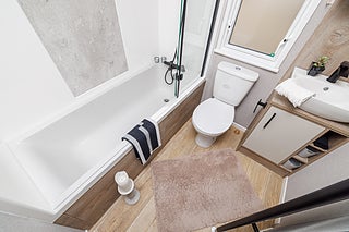Till detta sovrum hör ett badrum med badkar, badrumsskåp och handdukstork.
