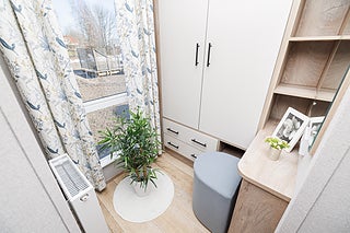 Det större sovrummet har en rymlig dubbelsäng med stoppad sänggavel, samt ett kombinerat sminkbord/skrivbord med spegel och förvaring. Garderoben erbjuder gott om plats, och under sängen finns extra förvaringsutrymme.