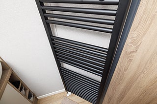 Ett andra badrum nås från hallen och är utrustat med dusch, handfat med kommod och handdukstork.