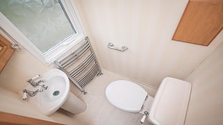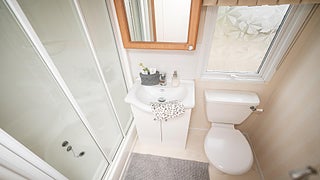 Det andra badrummet i vagnen erbjuder all bekvämlighet med wc, handfat och en rymlig duschkabin.