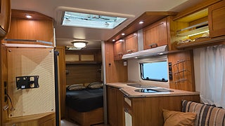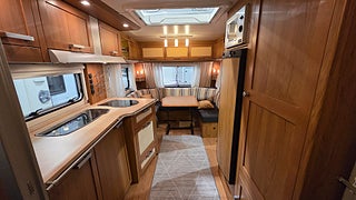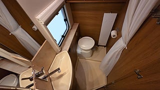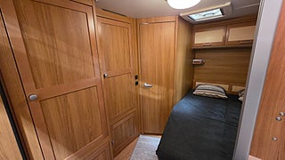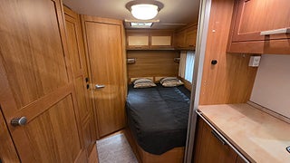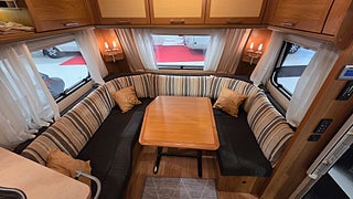 Knaus Royale 560 Scandinavian Edition 09- Bred dubbelsäng bak med toalett och dusch bredvid sängen. Bäddbar sittgrupp fram där två vuxna lätt får plats.