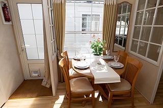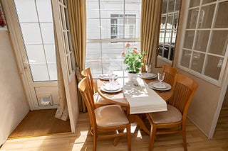 Vid köket hittar vi matplatsen med bord och stolar insvept av glasväggar.