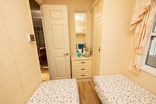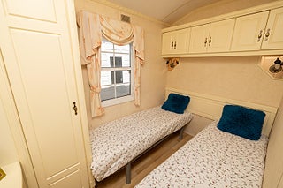 I gästrummet hittar vi två enkelsängar, garderob och en byrå.