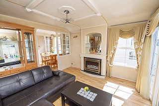 I vardagsrummet hittar man en fin hörnsoffa i skinn med dubbla altandörrar, ett vitrinskåp med glashyllor en kamin som både är fin att titta på och även ger värme på dom kallare dagarna.