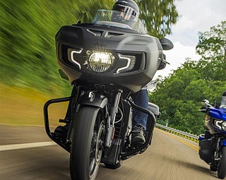 Helsvart, mörk “Dark Horse”-finish med LED-strålkastare, tonade fairinglamps och rödkantade 19"/16" sportfälgar – designad för att synas.