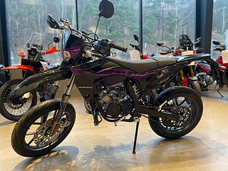 50cc SuperMotard modell med 17" fälgar skodda med greppvänliga Michelin däck. Kraftfull 300mm bromsskiva fram och rejäl fjädringsväg. Driftsäker Minarelli AM6 motor med Vattenkylning och separat oljetank.
