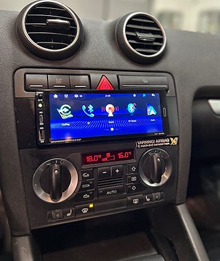 Bilen har extra skärm med bland annat bluetooth, Media och flera andra funktioner.
