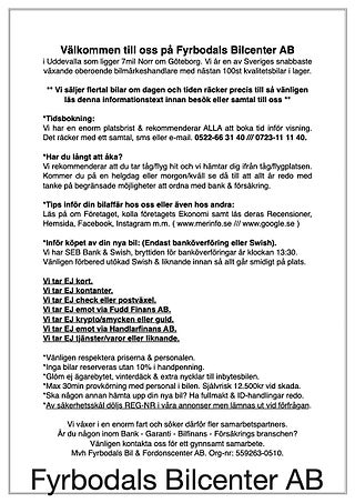 **Vi har platsbrist i våra lokaler därefter endast tidsbokning hos oss för visning av bil. Alla bilar är inte i en & samma lokal & tas fram efter tidsbokning om inte ni dirigeras till en annan visningslokal i närheten efter tidsbokning. Alltså inga drop-in besök hos oss. Därför är det viktigt att du ringer/-smsar/-mailar innan besök så ser vi till att bilen är redo för visning**