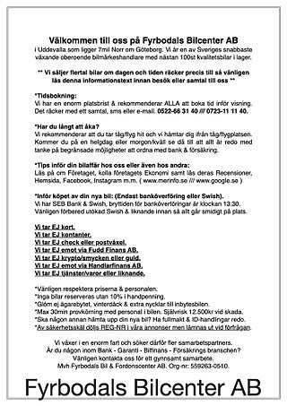 **OBS ! - Vi övergår till en Online-butik & därför har vi börjat med provkörningsavgift på 495kr för att täcka tvätt & bränslekostnader - Halva avgiften skänker vi till barncancerfonden.se - Vi bjuder på avgiften om det blir affär. Endast tidsbokning, inga inbyten, inga förmedlings uppdrag, inga inköp, vi jobbar endast med egna noggrant utvalda lagerbilar - ! OBS**
