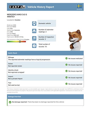 CARFAX-rapporten hjälper dig att spara pengar genom ett säkrare köp. Den hjälper dig att upptäcka fusk med mätarställningen, besiktningshistorik, misstänkta importer, dolda fel och mycket annat.
