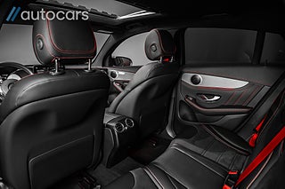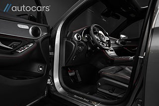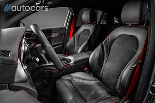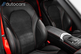 Kupén präglas av genomtänkt lyx och hög komfort, där ett stort öppningsbart panoramatak släpper in generöst med ljus och förstärker den rymliga känslan. Eljusterbara framstolar med dynförlängning bidrar till en bekväm körupplevelse, medan svart ARTICO/DINAMICA klädsel tillsammans med röda säkerhetsbälten och kontrasterande röda sömmar skapar en sportig och stilren helhet. Den eftertraktade AMG Supersportratten i Läder/Mikrofiber förstärker känslan av sport och ger föraren en direkt och engagerad kontakt med bilen.