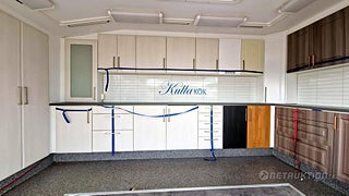 Ombyggd utställningsvagn för exponering av köksinredning.