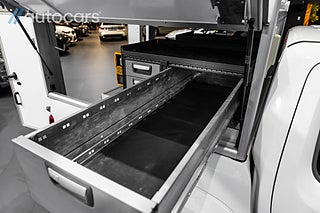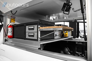 Bakom hytten sitter ett gediget påbyggnadskåp från Karossan, konstruerat för yrkesanvändning med dörrar bak och öppningsbara sidoluckor som gör varje arbetsmoment snabbare och smidigare. Invändigt finns professionell verkstadsinredning från Modul System, där funktion möter struktur och varje verktyg har sin plats. 230V invertern med extra batteri gör att du kan driva utrustning direkt från bilen, oavsett var jobbet befinner sig. För extra säkerhet finns även brandsläckare monterad i skåpet, en detalj som säger allt om hur genomtänkt denna Amarok är.