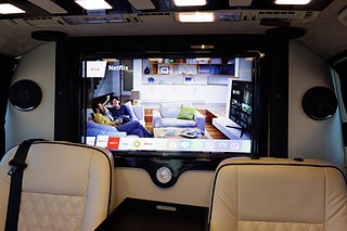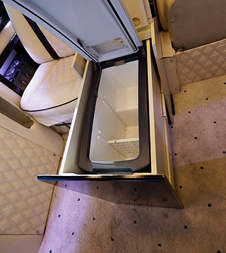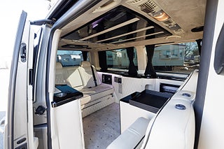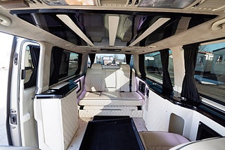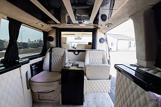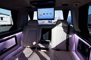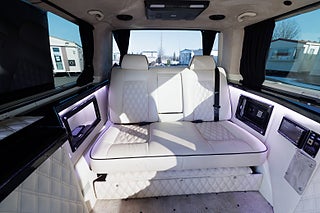 Oavsett om ni söker ett mobilt kontor, extra komfortabelt resande eller känner att ni vill visa upp en extravagant livsstil så är detta bilen för er. Dyk upp utanför röda mattan till den där Premiären, direkt utanför entrén till nattklubben, till konserten, hämta dina VIP kunder på flygplatsen eller tågstationen, resan till affärsmötet där man jobbar helt ostört o fokuserat, resan hem från det framgångsrika affärsmötet där man firar framgången med kollegorna och lite bubbel, jag möjligheterna är helt oändliga för denna unika extra lyxiga bil. Bilen är bygg med absolut högsta standard och funktion som ledstjärna, den stora lounge kupé delen erbjuder en soffa som man kan el-justera ner till nästan helt liggande för de längre resorna, det finns 2 mycket komfortabla fåtöljer, el-styrda bord, champagne kyl, kaffemaskin, 2 tv skärmar (varav en avskärmar till förare delen), ljudanläggning som styrs via panel eller mobilen. Både soffa, stolar och delar av inredning är skinn klädd med hög finish, polerade svarta trä inrednings detaljer skapar en känsla av lyx rakt igenom hela kupén.