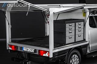 Det här exemplaret är utrustat för att verkligen göra jobbet enklare. Påbyggnadskåpet från Ydreskåp erbjuder tre öppningsbara luckor som ger snabb och smidig åtkomst till din utrustning. Invändigt finns ett smart lådsystem från Modulsystem som håller ordning på verktyg och maskiner vilket gör bilen till en komplett mobil arbetsstation. På taket finns både steghållare och lasthållare, inklusive en utdragbar lösning, perfekt för långa föremål som reglar, rör eller stegar.