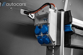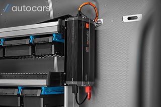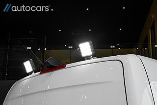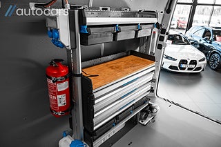När vi öppnar dörrarna till skåpet blir det tydligt vad vi talar om. Proffsbyggd verkstadsinredning från Tyska Sortimo med en byggkostnad överstigande 300.000 SEK. Inklätt skåp med kraftig LED belysning och rörelsevakt, Full ståhöjd, Webasto dieselvärmare bak för värme i skåpet, Arbetsbänk, First Aid kit, Verktygstavlor, Kompressor, Luftvinda, Brandsläckare, Modulsystem med förvaringslådor, Vattendunk, Dubbla batterier, Uttag för 230 V som är kopplat till kraftig Osram inverter med tillhörande undercentral från ABL.