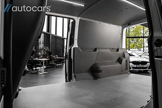 Den långa modellen erbjuder imponerande lastutrymme, fullt inklätt med hållbart material och elegant ledbelysning som ger en modern, professionell känsla även vid kvällsjobb. De dubbla skjutdörrarna och dragkroken gör Transportern lika flexibel som kraftfull, medan takräcket öppnar upp för ännu fler möjligheter.
