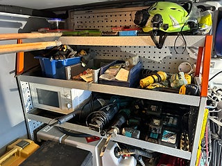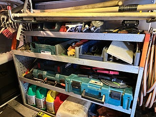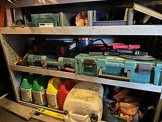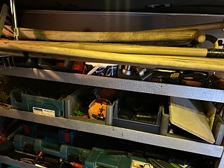 Borr, bits, gängtappar och verktyg blandat i lådorna